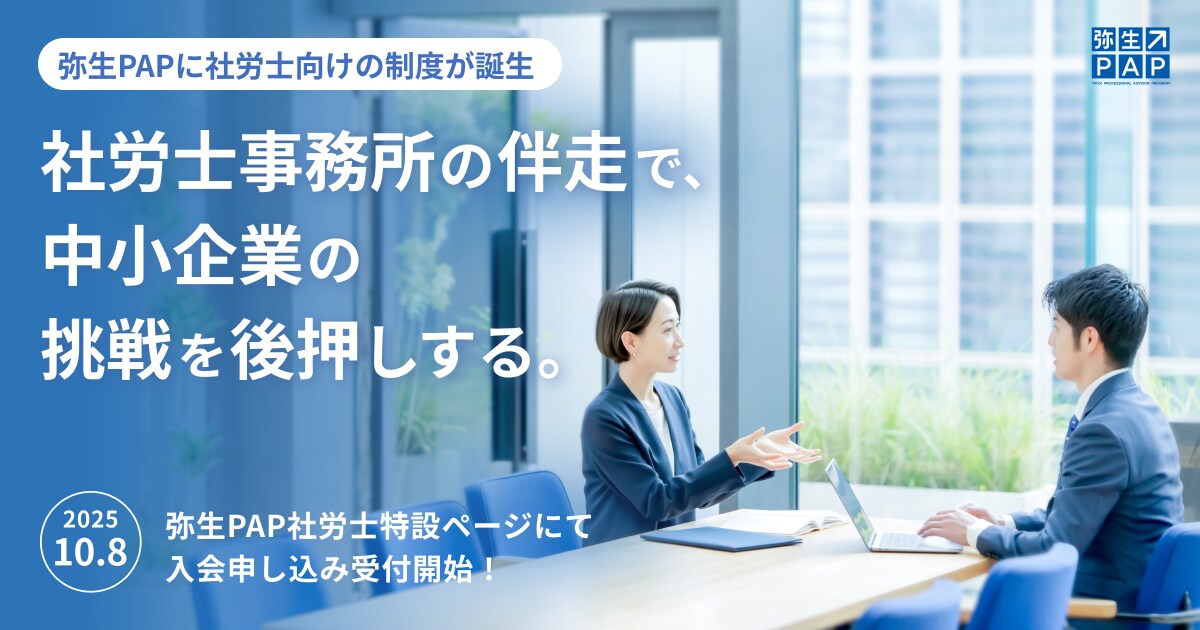 弥生株式会社(本社:東京都千代田区、代表取締役 社長執行役員 兼 CEO:武藤健一郎、以下「弥生」)は、会計事務所向けパートナープログラム「弥生PAP」に、社会保険労務士(以下、社労士)向けの新たな入会区分「弥生PAP社労士」を新設しました。あわせて、初年度年会費が無料となるキャンペーンを実施いたします。![]()