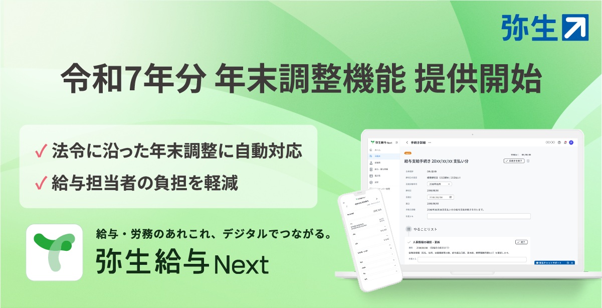 弥生株式会社(本社:東京都千代田区、代表取締役 社長執行役員 兼 CEO:武藤健一郎、以下「弥生」)は、クラウド給与サービス「弥生給与 Next」の令和7年分年末調整機能を10月30日(木)より提供開始しました。今回の年末調整機能は、令和7年度税制改正や各種申告手続きに対応し、より効率的な年末調整業務を実現します。 ![]()
