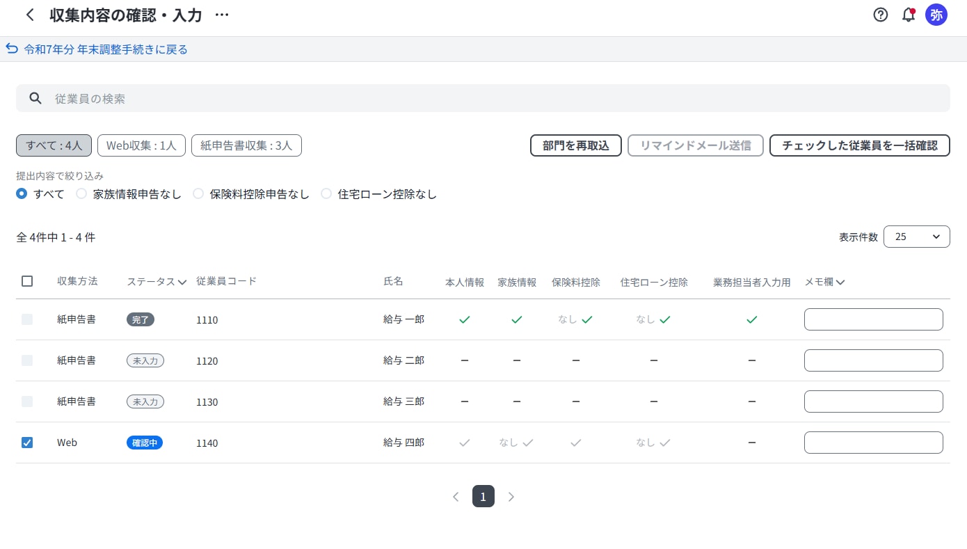 申告の有無や進捗状況が一目で分かり、未提出者へのリマインドメール送信や、一括確認済み処理も可能になりました。メモ欄や部門表示など、実務担当者の管理業務をサポートする機能も追加しています。