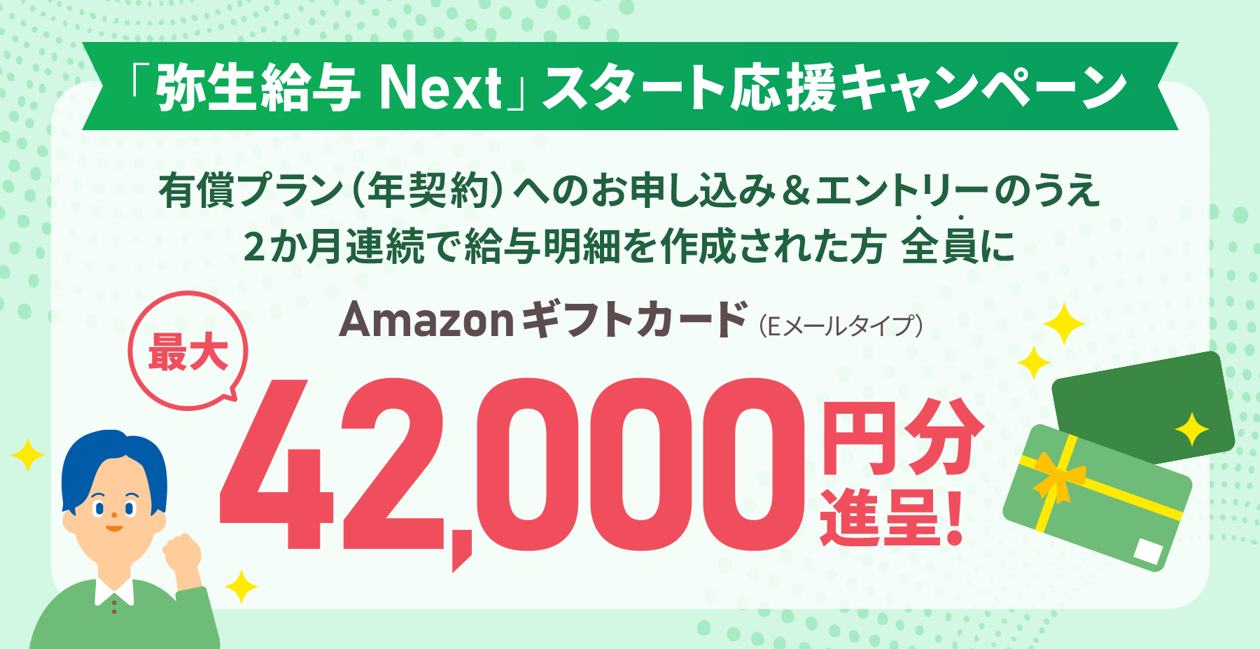 「弥生給与 Next」では、2025年10月1日~2026年1月31日の期間中、年契約でお申し込みいただいた方を対象に、2か月連続で給与明細を作成された方全員にAmazonギフトカード(Eメールタイプ)をプレゼントする「弥生給与 Next」スタート応援キャンペーンを実施中です。