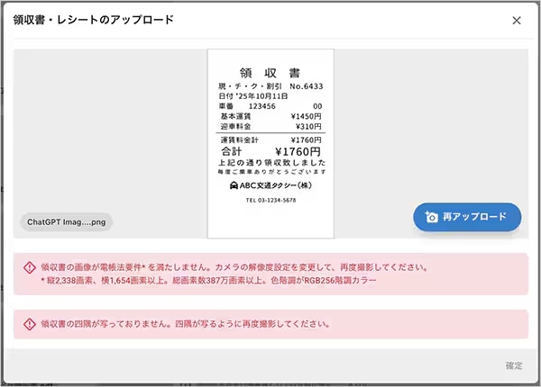 領収書をアップロードすると、システムが自動的に電子帳簿保存法に対応した形式・要件を満たしているかをチェックします。