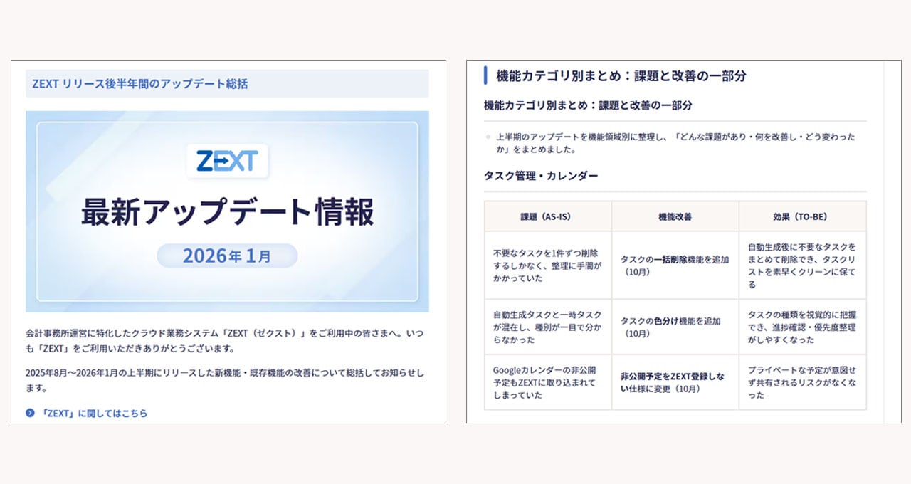 「ZEXT」は、2025年5月のβ版提供時より一貫して、会計事務所の運営における困りごとに徹底的に寄り添ってきました。営業担当による伴走支援サポートも手厚く行い、実際のユーザーの声をタイムリーに反映し、正式リリース後は6カ月で50個以上の大小さまざまな機能アップデートをきめ細やかに実施しています。