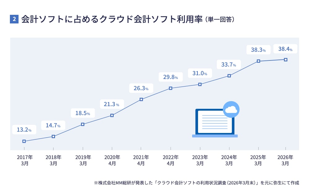 弥生株式会社(本社:東京都千代田区、代表取締役 社長執行役員 兼 CEO:武藤健一郎、以下「弥生」)は、株式会社MM総研が2026年4月に発表した「クラウド会計ソフトの利用状況調査(2026年3月末)」において、クラウド会計ソフトの事業者別シェア54.0%を記録したことをお知らせいたします。これにより、弥生は調査開始以来、11年連続でシェアNo.1を達成いたしました。