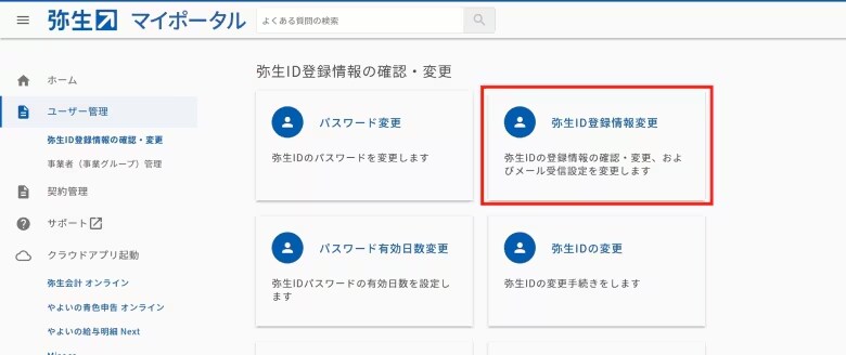 2「ユーザー管理」の「弥生ID登録情報の確認・変更」を選択
