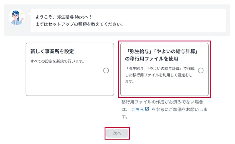 [「弥生給与」「やよいの給与計算」の移行用ファイルを使用]を選択し、[次へ]をクリックします