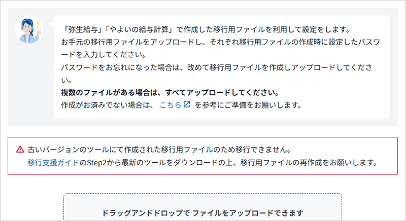 移行用ファイル作成ツールが最新ではない場合、メッセージが表示されます。