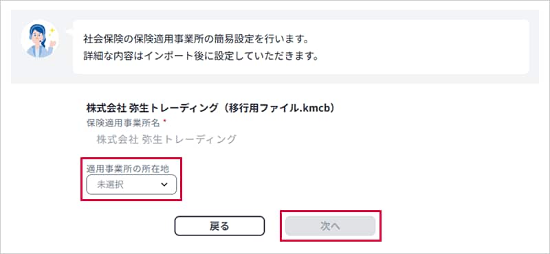 事業所データから変換した移行用ファイル(.kmcb)をアップロードし、作成時に設定したパスワードを入力して[次へ]をクリックします