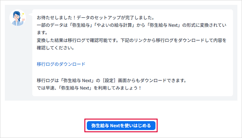 移行ログはこの画面でダウンロードしなかった場合も、「弥生給与 Next」の[設定]画面でもダウンロードできます。