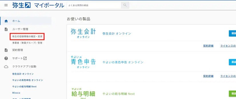 2「ユーザー管理」の「弥生ID登録情報の確認・変更」を選択