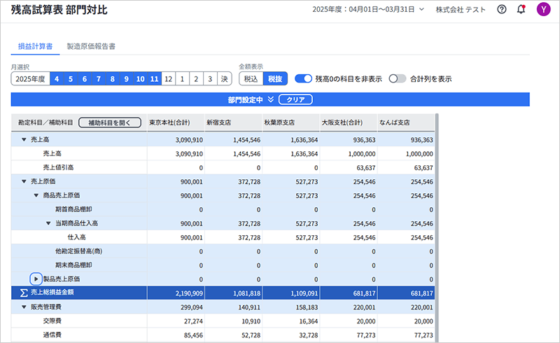 部門ごとに損益計算書・製造原価報告書の試算表を確認でき、経営の意思決定に役立ちます。