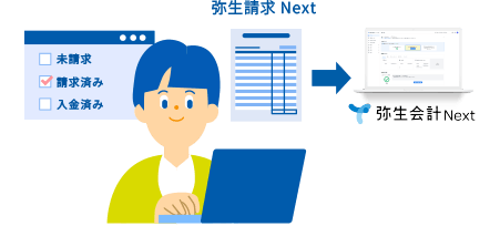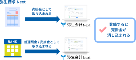 銀行口座に連携すると、毎日の入出金明細が自動で取り込まれます。売掛金は弥生請求 Nextで発行すると、弥生会計 Nextに「売掛金」として取り込まれます。銀行に入金があると、その明細が取り込まれ、仕訳候補として「普通預金/売掛金」と提示されるので、登録すると売掛金が消込されます。