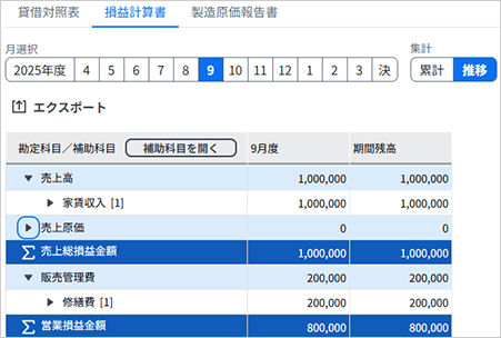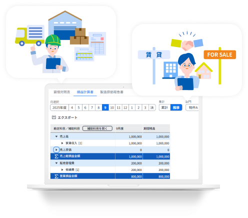 部門管理機能の活用で、物件別・取引先別に収支を把握できます。例えば物件ごとの収支を把握する場合、部門(例:物件A、物件Bなど)を仕訳登録時に入れておくと、残高試算表でかんたんに確認できます。