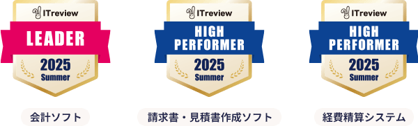 「ITreview Grid Award 2025 Summer 会計ソフト、請求書・見積書作成ソフト、経費精算システムカテゴリー」3部門で受賞。お客さまに圧倒的な支持を受けています