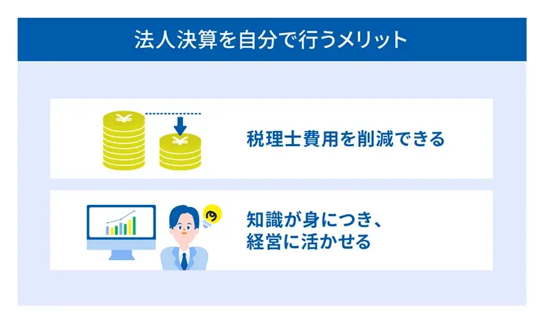 法人決算を自分で行うことで、どのようなメリットがあるのでしょうか。ここでは、法人決算を自分で行うことによって得られる主な2つのメリットをご紹介します。