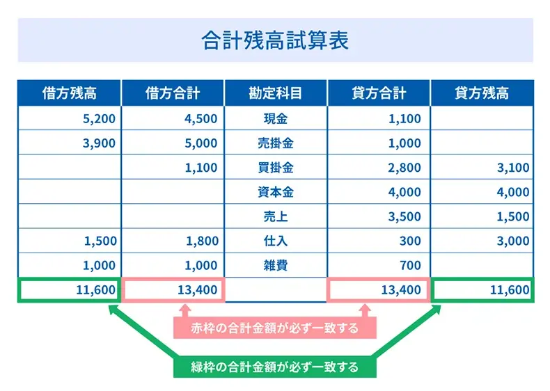 | 合計残高試算表 | 上記2つを組み合わせたもの。法人の決算では、取引の規模と残高を同時に確認できるこの形式が最も一般的に作成される |