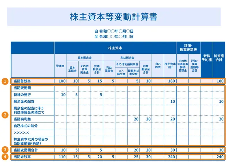 当期末残高:期末時点での残高のこと。当期首残高から当期変動額合計を加減した金額を記入する。当期の貸借対照表における「純資産の部」の各項目と金額が一致する。