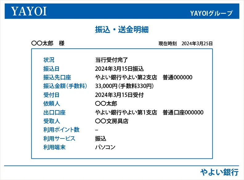 ネットバンキングを利用した際の振込・送金明細の例