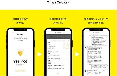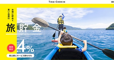 旅行資金を自動で積み立てることができる旅行積立アプリ「TABI CHOKIN」を運営しています。旅行の予定にあわせて目標額と満期時期を自由に設定でき、積立額と2%のサービス額を合わせた”旅貯金”を、宿泊、航空券やレンタカーの手配にご利用いただけます。最大の特長は、積立期間に関係なく2%のサービス額が積立額に付与されること。来年の旅行のためにコツコツ貯めるのも、来月の旅行のために一括でも、2%のサービス額が付与されるので、低金利時代に大変お得な積立アプリです。