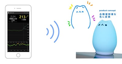 血糖値可視化アプリや健常者向け糖尿病予防プログラムなど色々つくりましたが、最近力を入れているのは、1型糖尿病の子供とそのご家族をターゲットにした、リアルタイム血糖値と連動して色が変化するIoT照明「looook(ルーク)」です。
