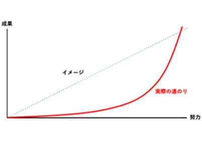 つまり、最初のうちは努力してもなかなか成果が出にくいものなんです。お客さまも来ないし、経費ばかりかかって赤字が続く。でも、ある時期を過ぎると少しずつ成果が出始めて、最終的には努力以上の成果が出るようになる。そんなイメージです。