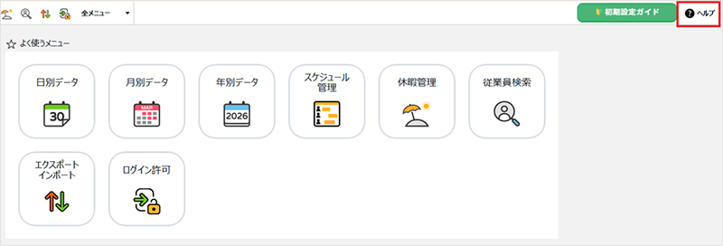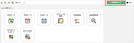 アカウント登録・基本情報登録はこちら「弥生勤怠 Next」ログイン後は、管理画面右上の「初期設定ガイド」から設定を進めることができます。