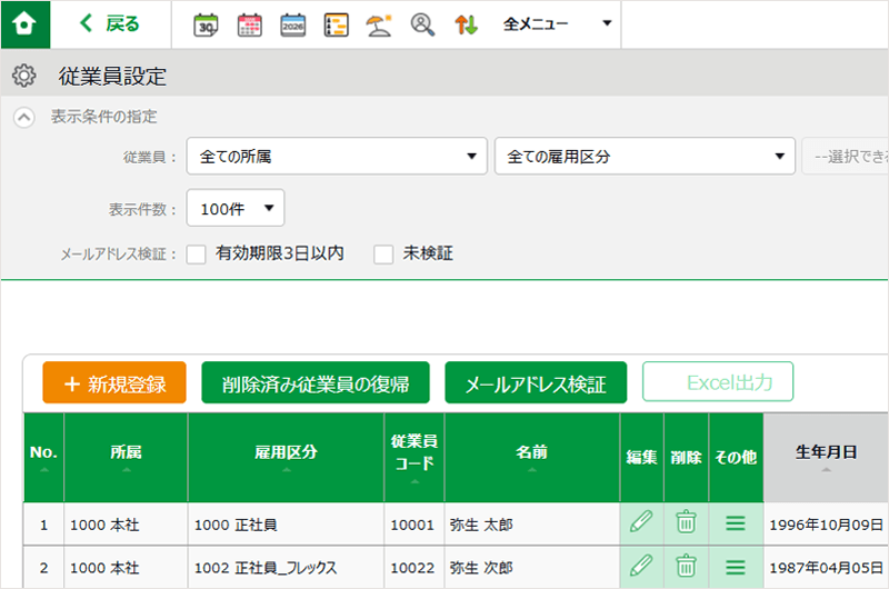 ホーム画面の 設定 ▶ 従業員 ▶ 従業員設定 にて、従業員データの新規登録や設定変更を行います。