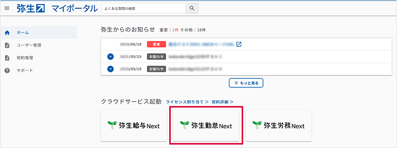 マイポータルから「弥生勤怠 Next」を起動します。