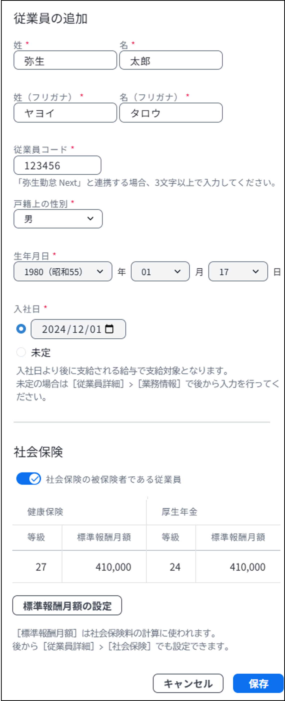 表示された画面に従業員の情報を入力して、[保存]をクリックします。