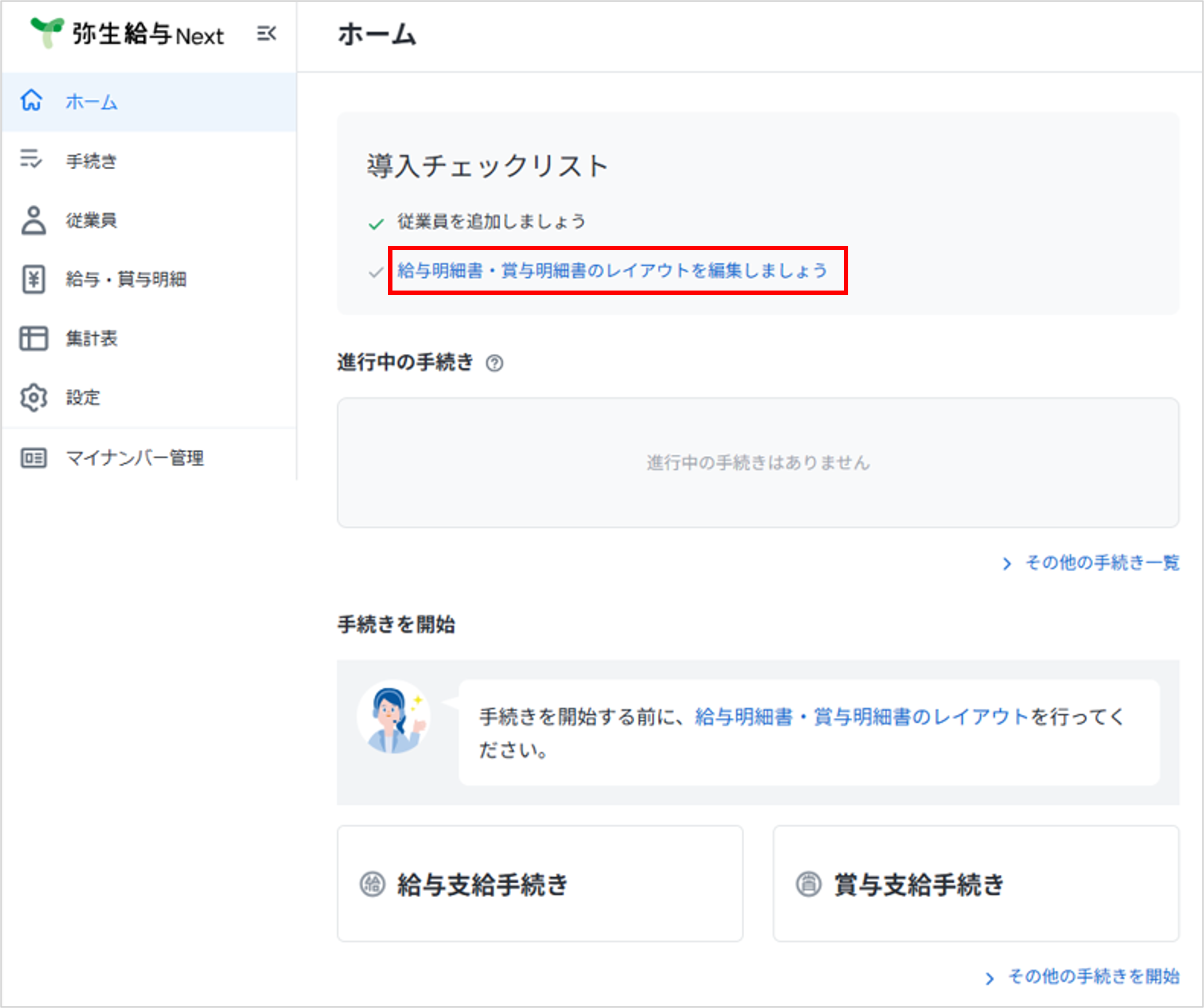 [導入チェックリスト]から[給与明細書・賞与明細書のレイアウトを編集しましょう]をクリックします。