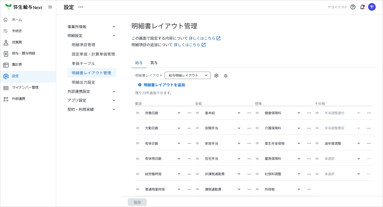 「勤怠」「支給」「控除」「その他」に必要な明細項目を設定して、[保存]をクリックします。