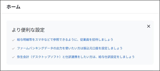 Web明細配信、FBデータ出力機能、弥生会計(デスクトップソフト)との仕訳連携機能をお使いになる方は、[より便利な設定]から設定を進めましょう。