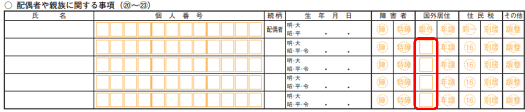 申告表 第二表[配偶者や親族に関する事項]において、親族が国外居住の場合に該当事項に応じた番号を印字することになりました。