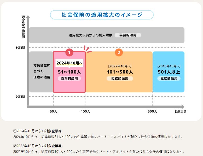 2024年(令和6年)10月から、短時間労働者に対する健康保険・厚生年金保険の適用拡大が行われます。
