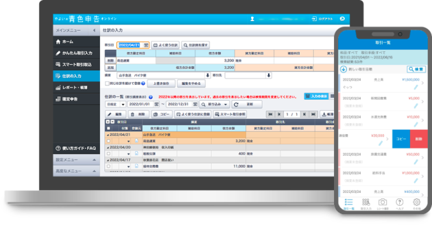 確定申告書や複式簿記帳簿などの青色申告に必要な書類が家計簿感覚でカンタンに作成できます。