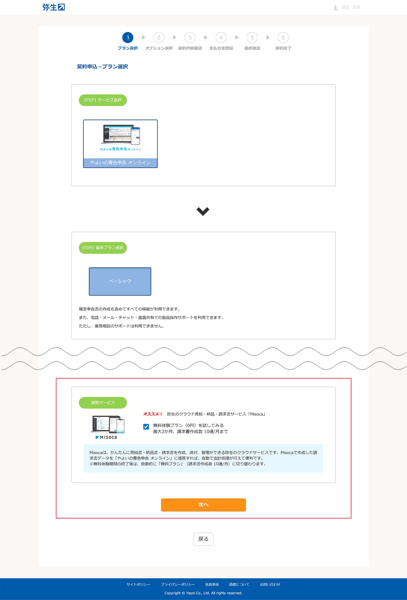 「やよいの青色申告 オンライン」の申し込みページから「Misoca」の同時申込のチェックをつけてお申し込みをすすめてください。