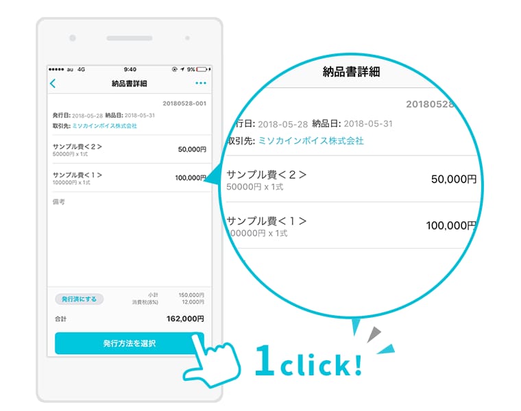 納品書の作成、ステータス管理ができます。メール送信手続きもアプリからワンクリックで完了します。外出先や移動中でのスキマ時間を効率的に使いたい方にオススメのアプリです。