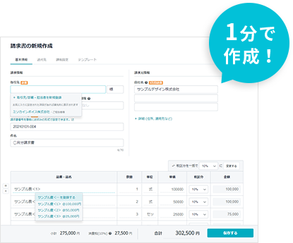 業務の知識がなくても大丈夫です。作成画面には、必要項目や消費税、源泉税の計算式があらかじめ設定されているから、入力するだけで請求書がすぐに作成できます。