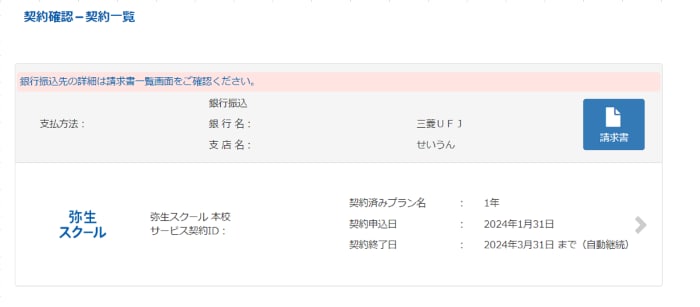 から確認できます。「弥生スクール」の契約内容が表示されていれば完了です。