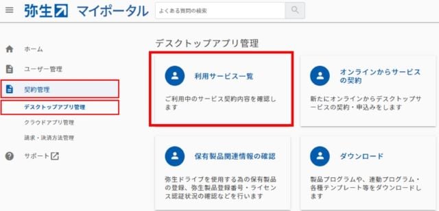 契約内容については「契約管理」-「デスクトップアプリ管理」の「利用サービス一覧」から「契約確認-契約一覧」
