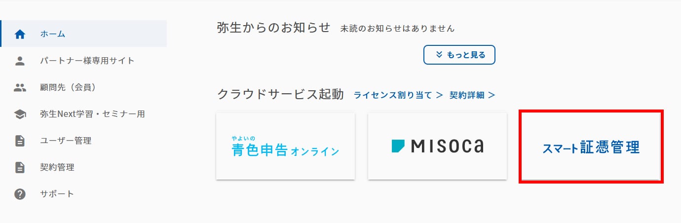 マイポータル(Web)ホーム画面の「クラウドサービス起動」に「スマート証憑管理」が表示されます。「スマート証憑管理」をクリックすると起動します。