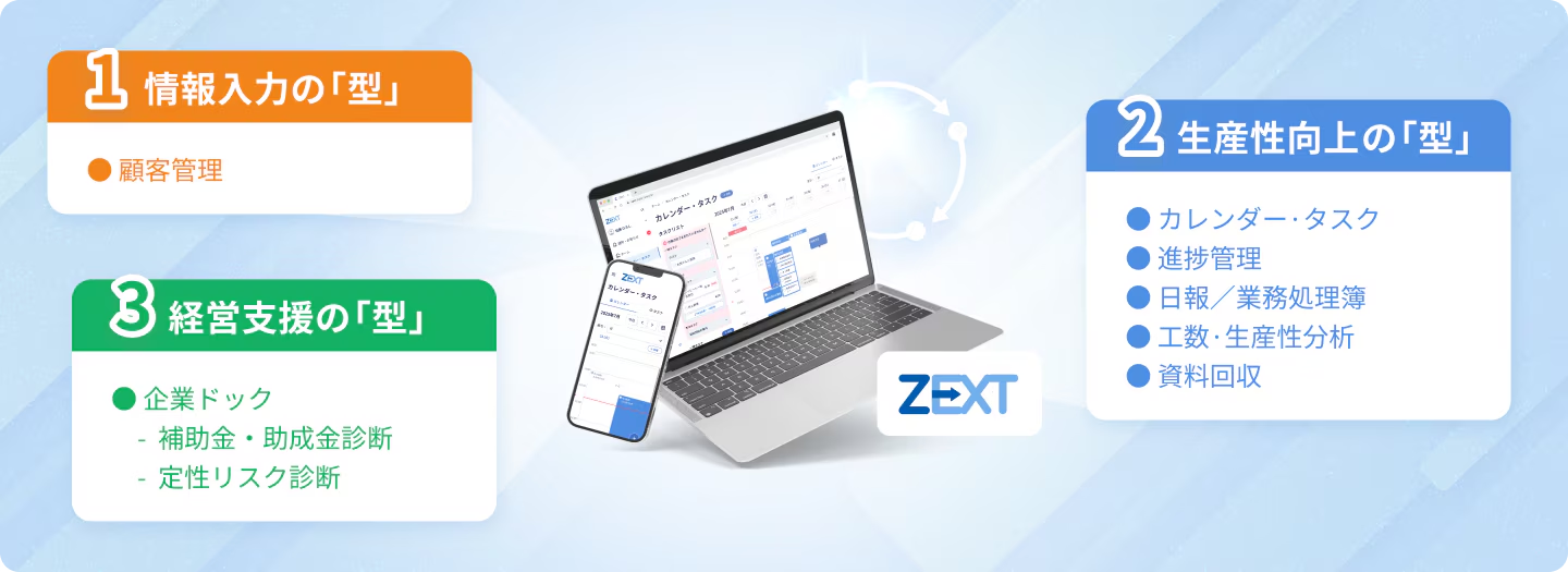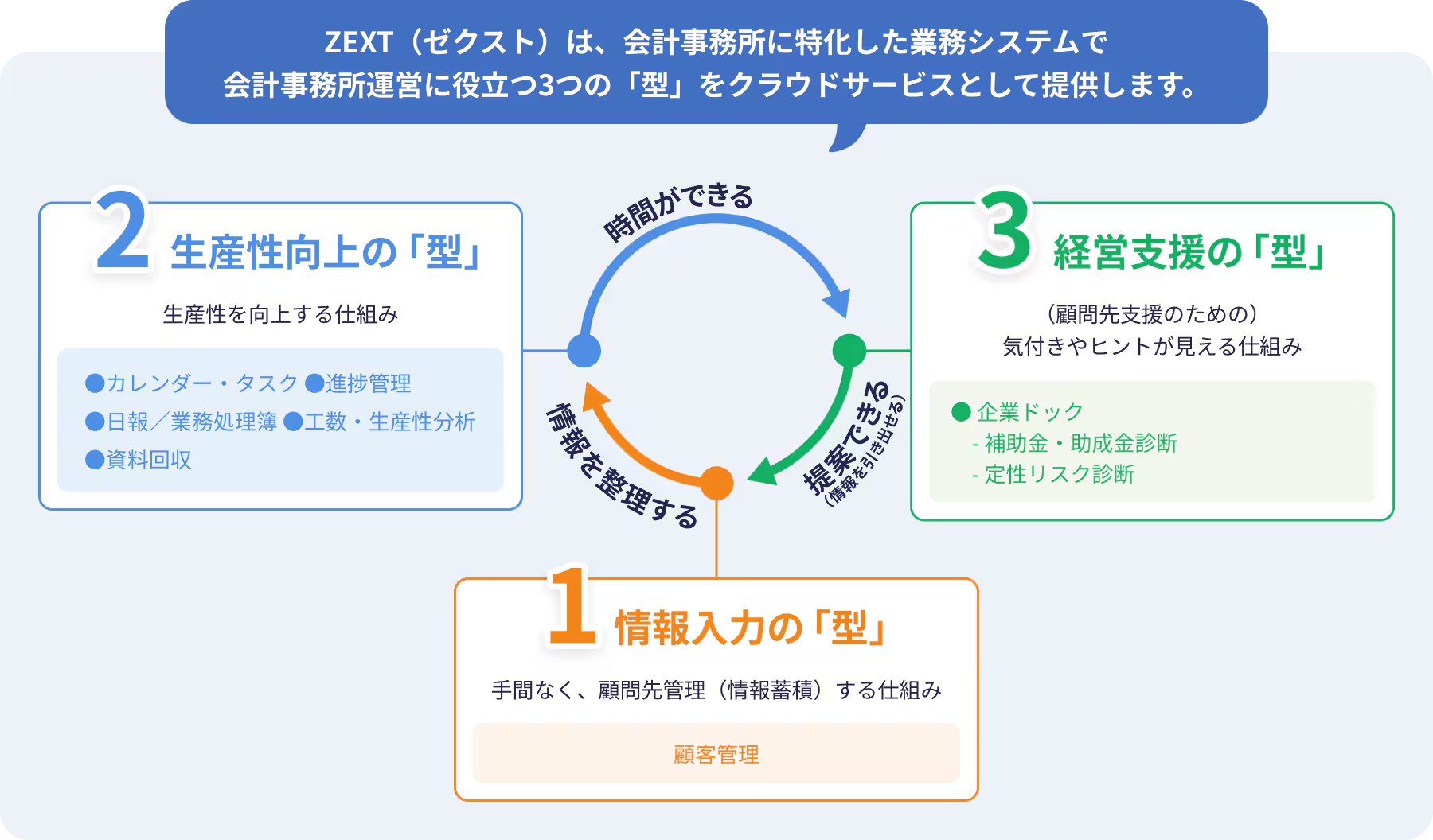 「ZEXT(ゼクスト)」は「❶顧問先管理」と「❷生産性向上」を起点に、顧問先に対する「❸経営支援」まで一気通貫で実践できることで、顧問先との継続的な関係構築を支援する、会計事務所向けクラウドサービスです。