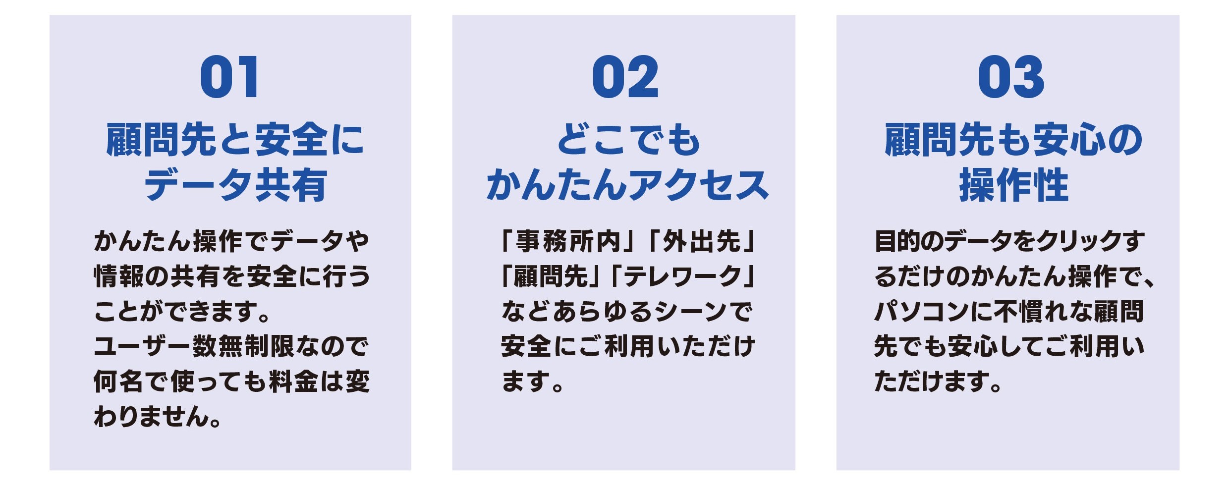 かんたんな操作で顧問先や提携士業とのデータ共有ができます。