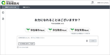 労務アシスタントAI特化型アシスタントAI自由会話、タイムカード集計、弥生製品※の操作補助