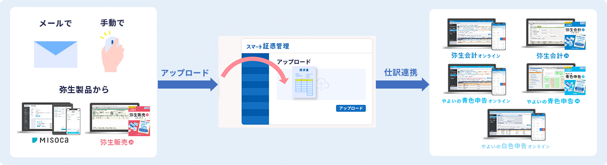スマート証憑管理は弥生製品と連携することで、証憑の保存・管理、検索・確認、仕訳データの作成などが可能です。