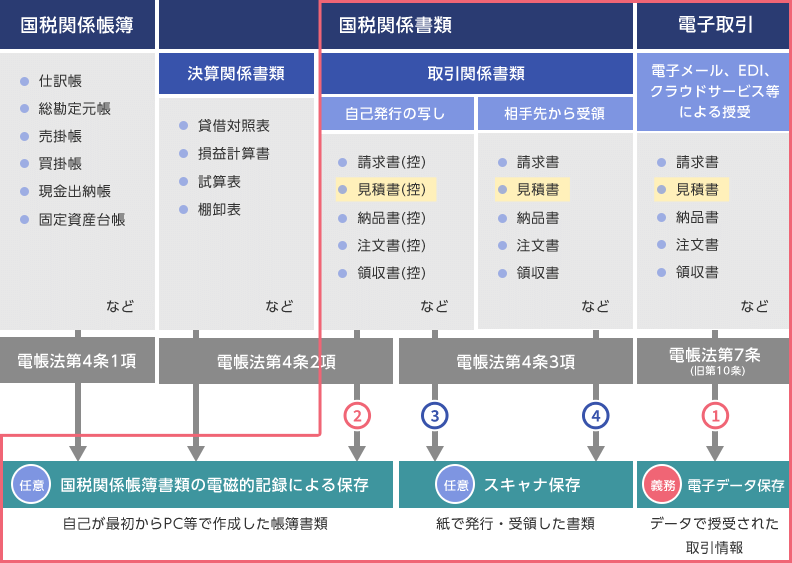 電子取引で見積書をデータで受領を行った場合は必ず「電子取引のデータ保存」の要件に合わせてデータ保存が必要です。一方、パソコンなどで電子的に見積書を作成し紙で取引先に送付した場合は、任意で電子データによる保存を選べます。その際は「国税関係帳簿書類の電磁的記録による保存(電子帳簿等保存)」の保存要件に則っていれば問題ありません。