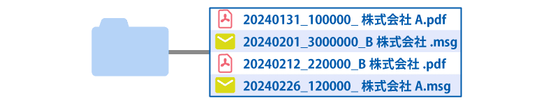 例えば、「2024年1月31日に株式会社Aから10万円の請求書をメール添付のPDFファイルとして受け取った」という場合は、ファイル名を「20240131_100000_株式会社A.pdf」にします。あるいは、書類の種類を明らかにするために「請求書_240131_株式会社A_100000.pdf」といった形も考えられるでしょう。