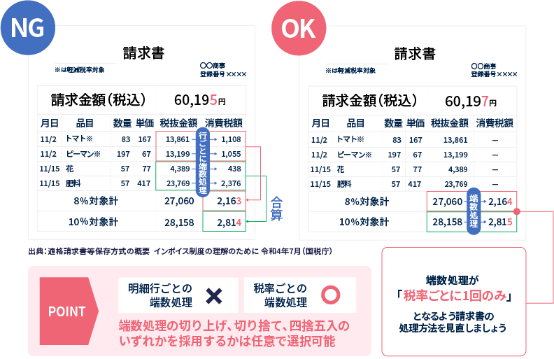 しかし、インボイス制度開始後の適格請求書では「1つの適格請求書につき、税率ごとに1回ずつの端数処理を行う」というルールが定められています。端数の切り上げ、切り捨て、四捨五入などについては、事業者が任意で決めて問題ありません。