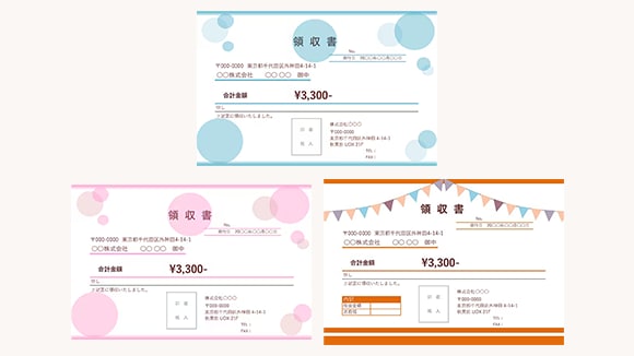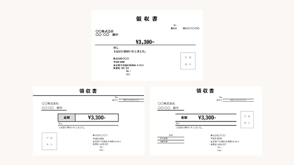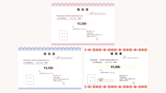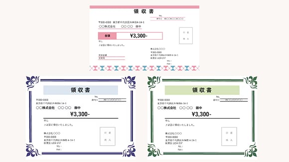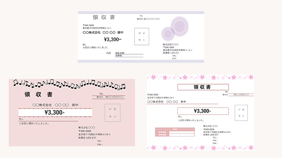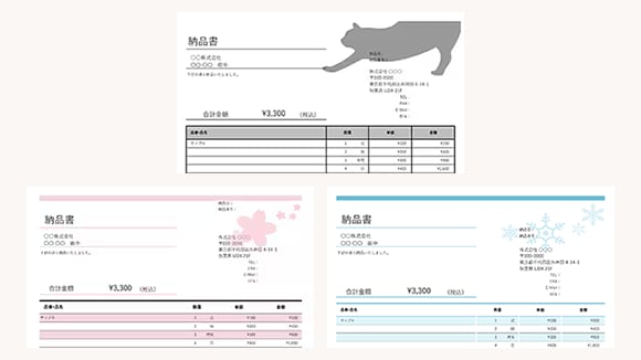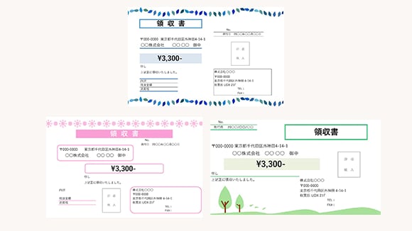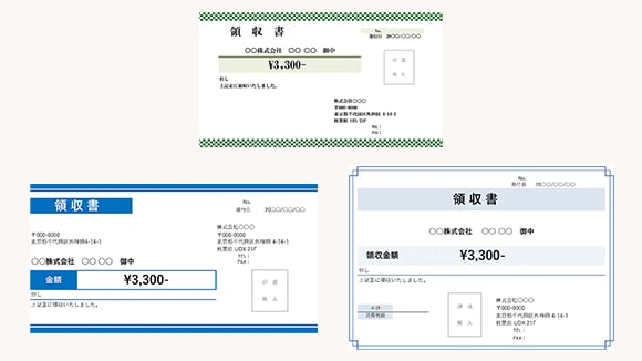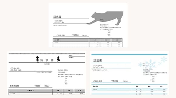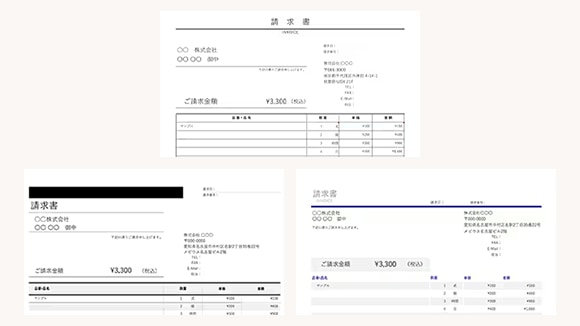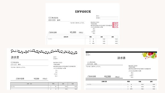 ビジネス向けからカジュアルなデザインまで、多彩なテンプレートデザインをご用意しました。一般的なフォーマットに加え、源泉徴収税の自動計算付き、立替経費に対応、納品書兼請求書といった機能的なフォーマットもございます。