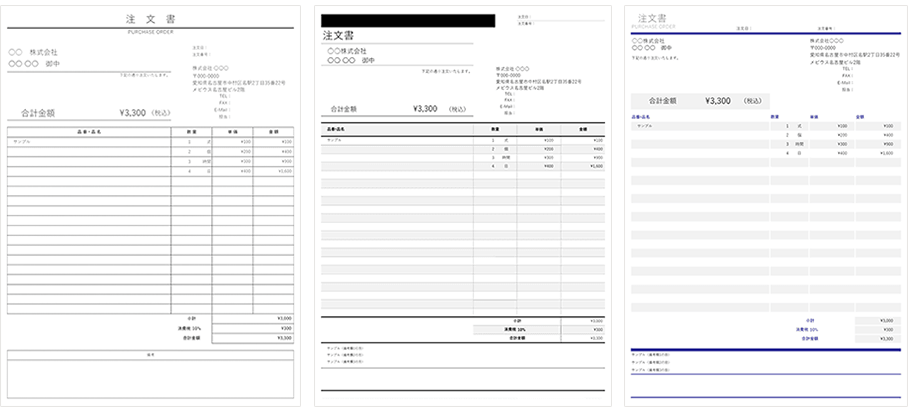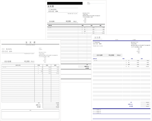 実用性に優れたオーソドックスなデザインが特徴のテンプレート。装飾を省いたシンプルな構成で記載内容が確認しやすく、スムーズな発注業務をサポートします。レッドやブルーのラインをアクセントにして視認性を高めたものもあり、業種やシーンを問わず幅広い取引先に対して使える汎用性の高さが魅力です。