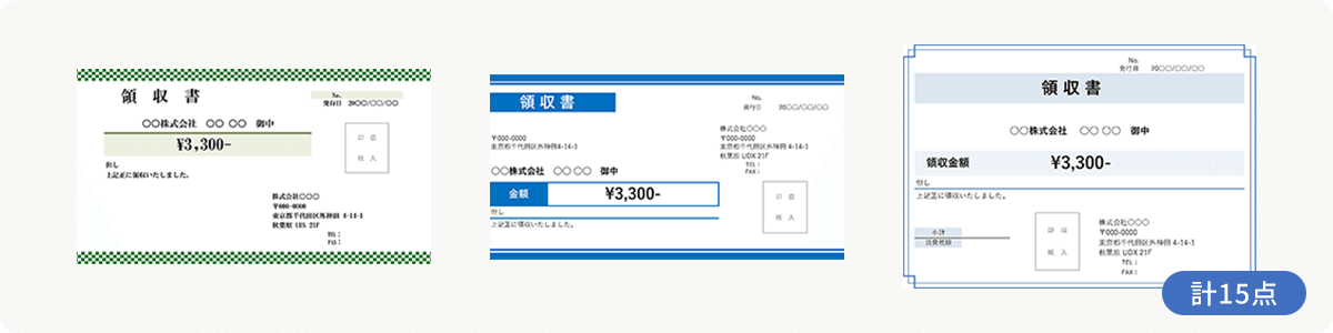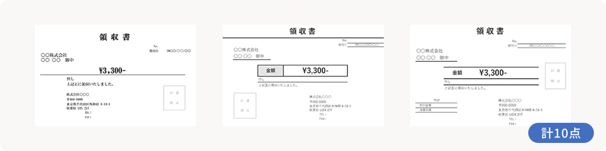 モノトーンを基調とした定番スタイルの領収書テンプレートを揃えました。全体にすっきりとまとめたもの、金額部分をやや強調したものなど、装飾性を省きつつも使い勝手の良いラインアップになっています。業種やシーンを選ばず幅広く使える実用的なデザインです。